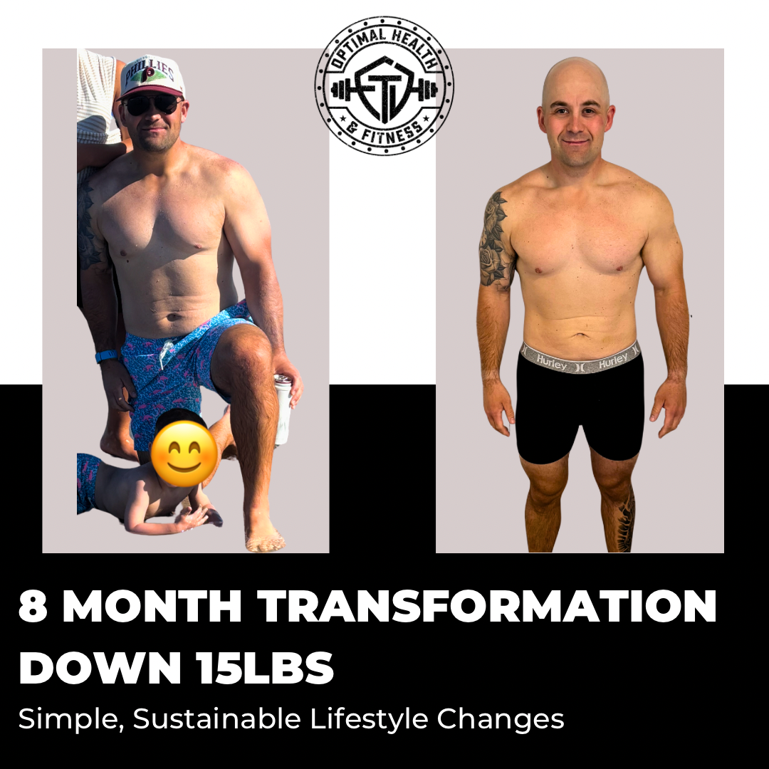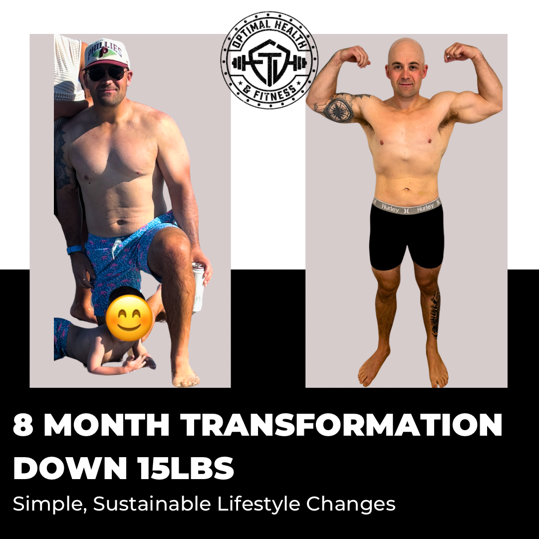 Round II with my guy Joe! Joe is busy, hard working father who accomplished this through the start of Summer including MULTIPLE family vacations! NO excuses, Joe enjoyed himself BUT also kept it all in check! Joe committed to our 3x strength training workouts per week and just staying active everyday. Remember, what we do OUTSIDE the gym and what we eat will have the biggest impact on our body comp! As a father, knowing Joe was showing up every single week with me, really motivated me as well. It’s never easy.. it’s always worth it 🤝💪🏻